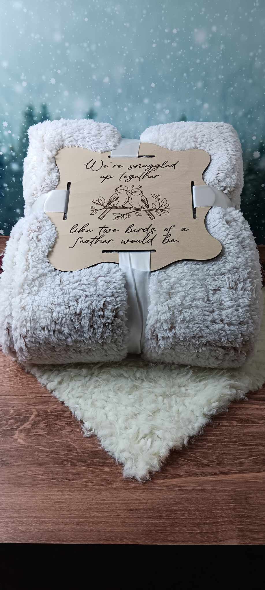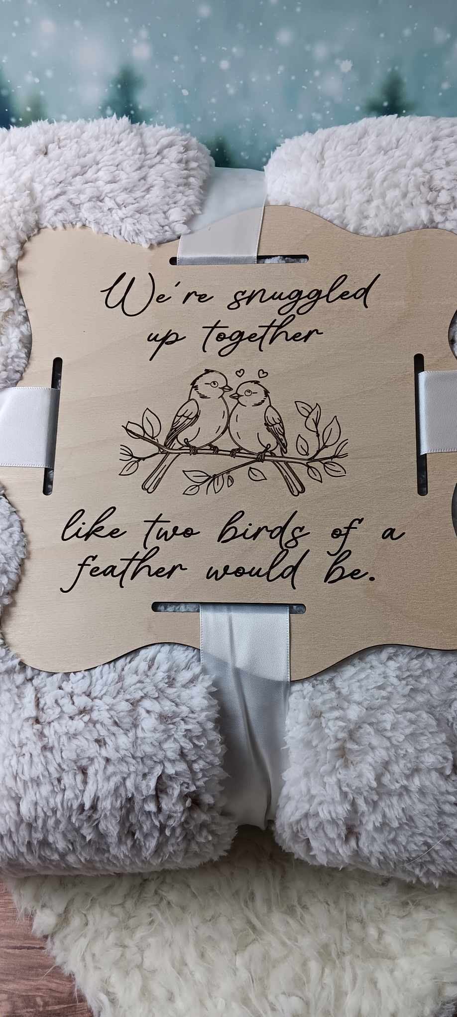 Wrap yourself or a loved one in the ultimate comfort with this plush, ultra-soft throw blanket. Featuring a heartwarming message etched on a beautifully crafted wooden tag—“We’re snuggled up together like two birds of a feather would be”—this blanket isn’t just a gift; it’s a sentiment of warmth and togetherness.