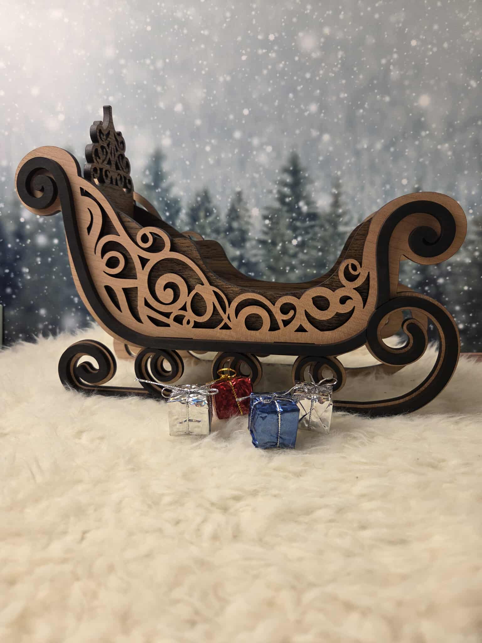 Bring festive charm to your holiday décor with this beautifully crafted Wooden Christmas Sleigh. Made from layered wood and intricately laser-cut with elegant scrollwork details, this sleigh makes a stunning centerpiece for any seasonal display.