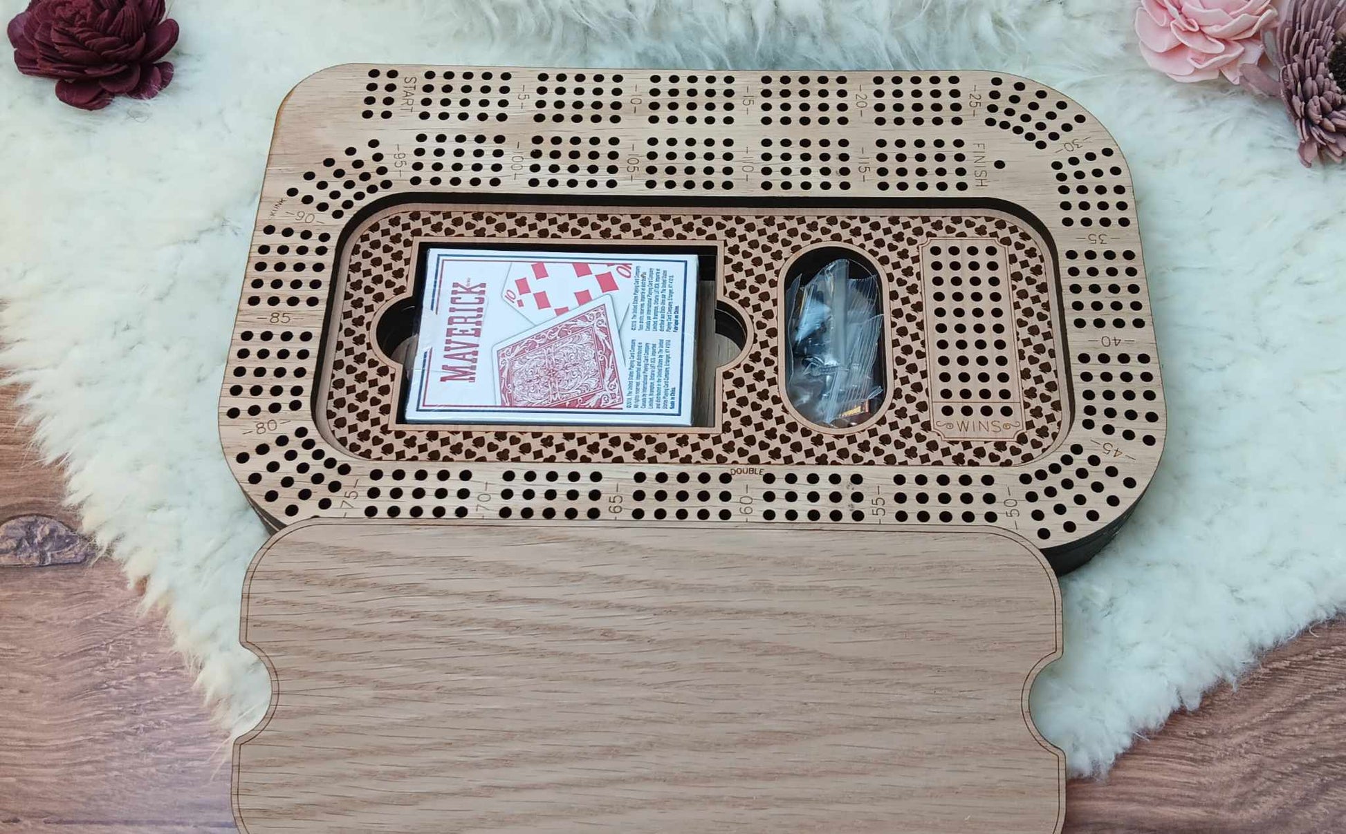 - Storage Compartment: A lid reveals a convenient storage area for the included playing cards and scoring pins.