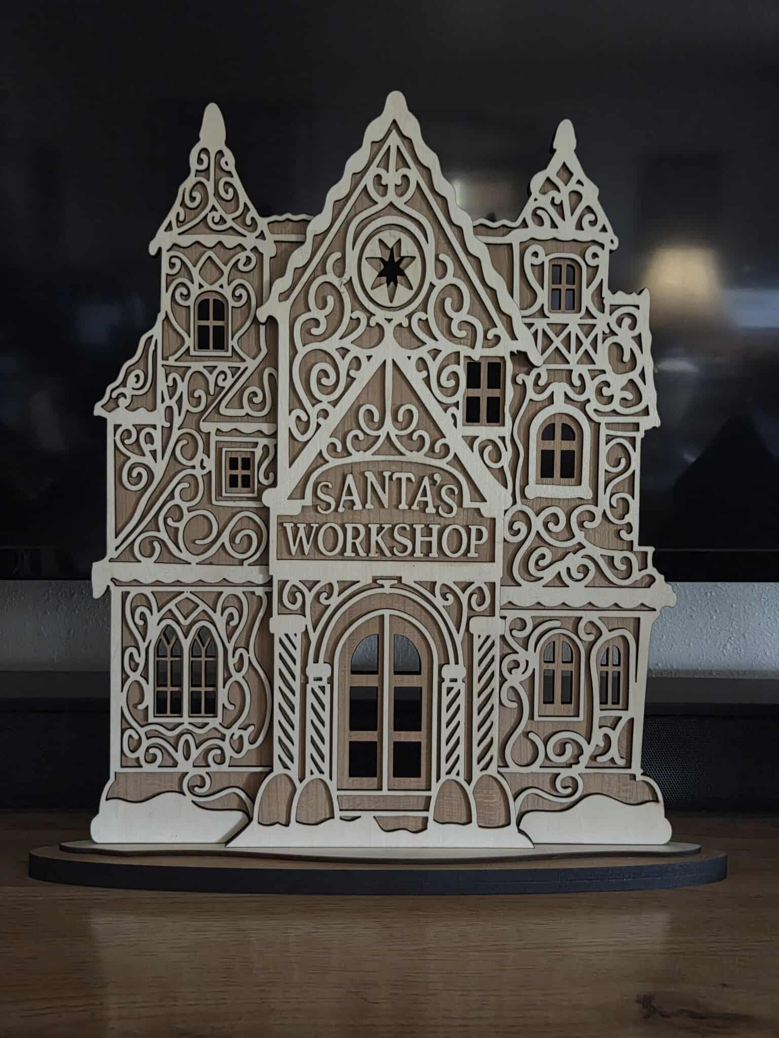 Santa’s Workshop: Standing an impressive 14.5" tall by 13" wide, this intricately detailed centerpiece features ornate and classic gingerbread house styling, making it a true focal point for your holiday décor.