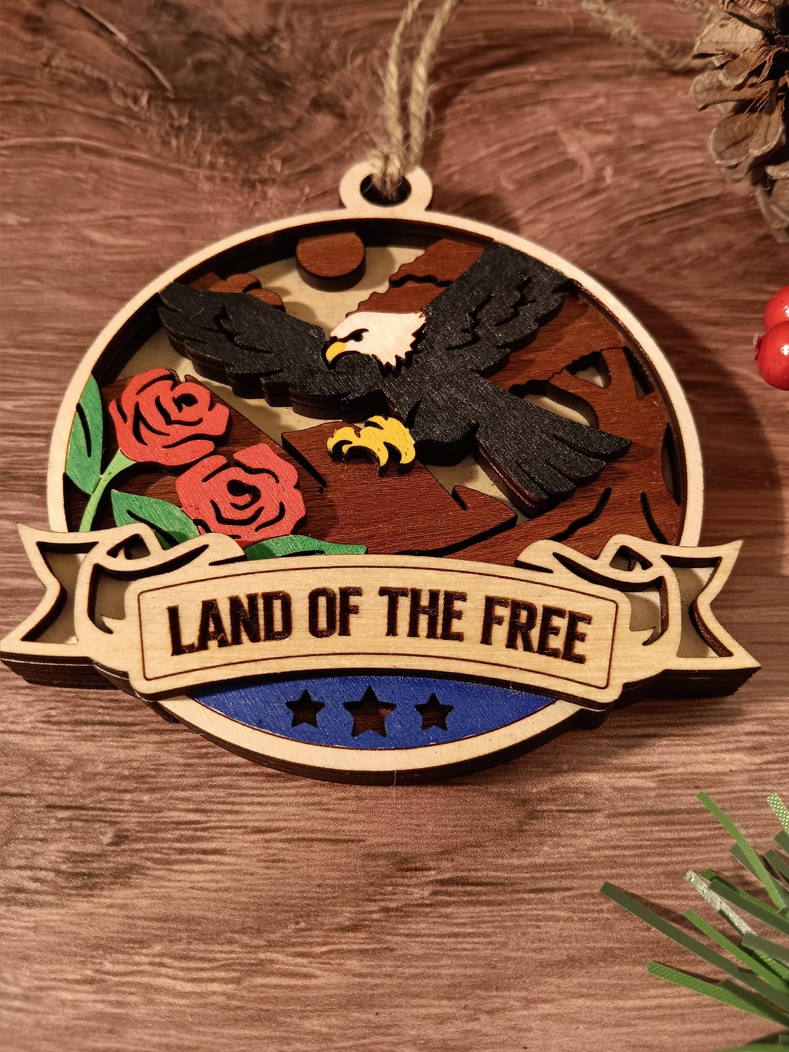 Celebrate your love for country with our stunning Land of the Free ornament, featuring a majestic soaring eagle. This intricately designed ornament consists of three layers, creating a beautiful depth and dimension.