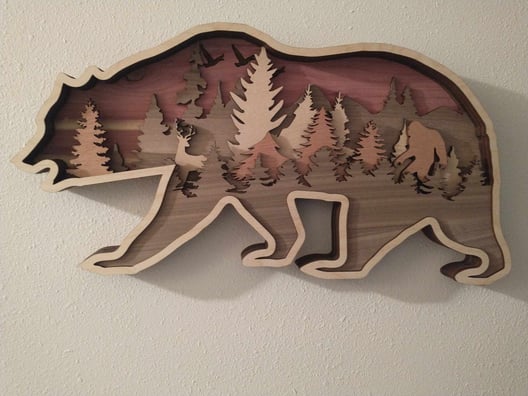 Each layer adds depth and dimension to the intricate design, which features not just the imposing bear but also a scenic backdrop complete with Bigfoot, graceful deer, and towering trees. The combination of these elements creates a dynamic and engaging portrayal of nature’s majesty.
