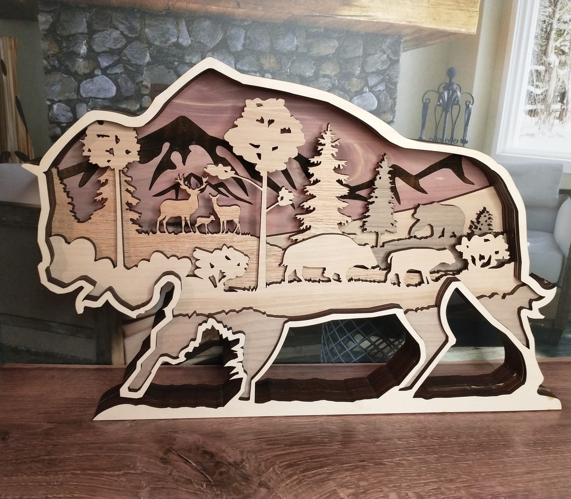 Ideal for display on a shelf or mantel, this sculpture captures the majestic spirit of the bison while adding warmth and elegance to any space. Each layer is expertly cut and assembled to create depth and dimension, making this a true work of art that will be a conversation starter in your home or office.