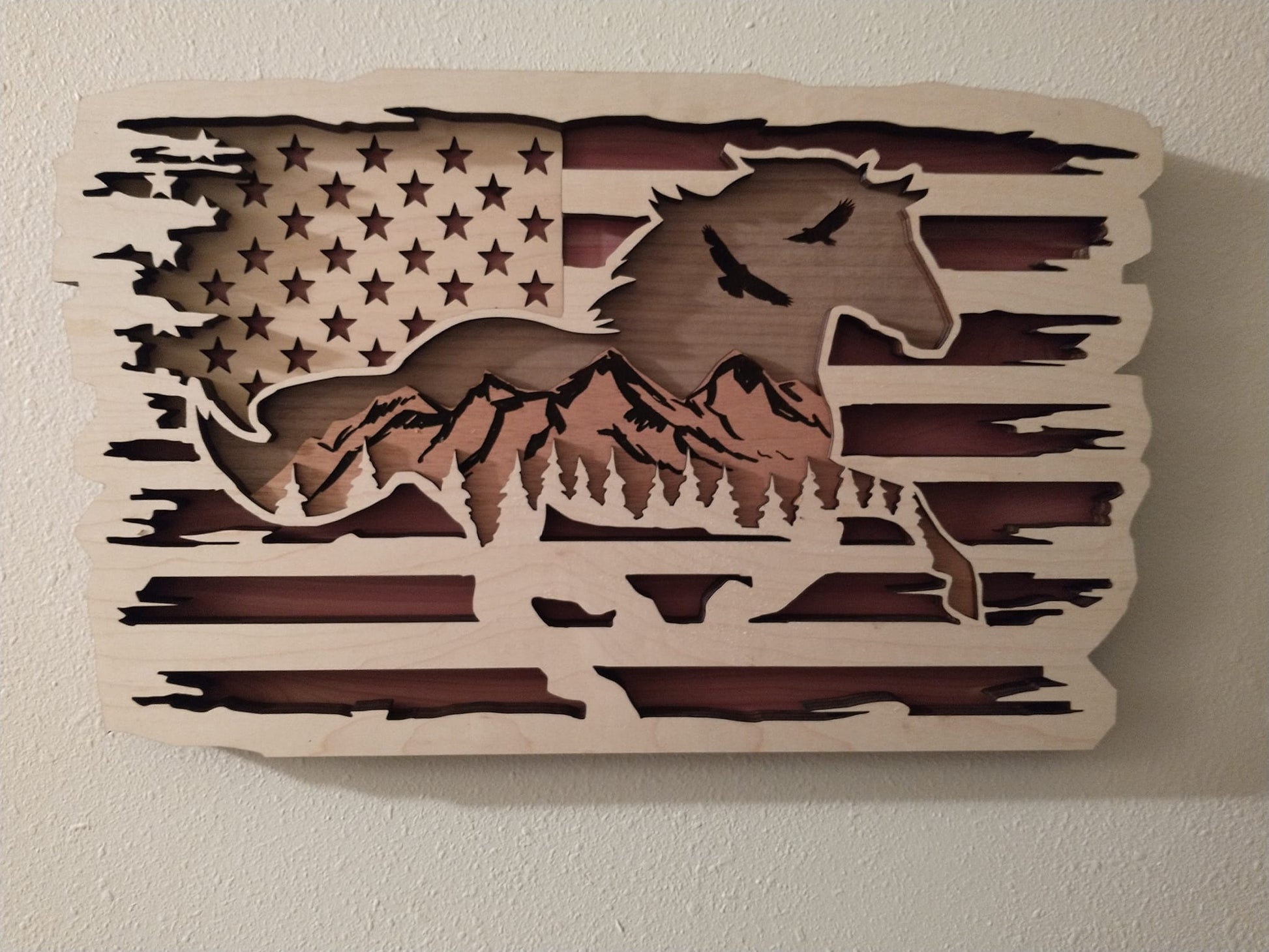 Enhance your home with the Scenic Horse Flag Décor, a stunning work of art that captures the beauty of nature and equestrian elegance. Crafted from five layers of premium woods—cedar, mahogany, maple, hickory, and walnut—this exquisite piece measures approximately 17" x 10.5", making it a striking focal point for any room.