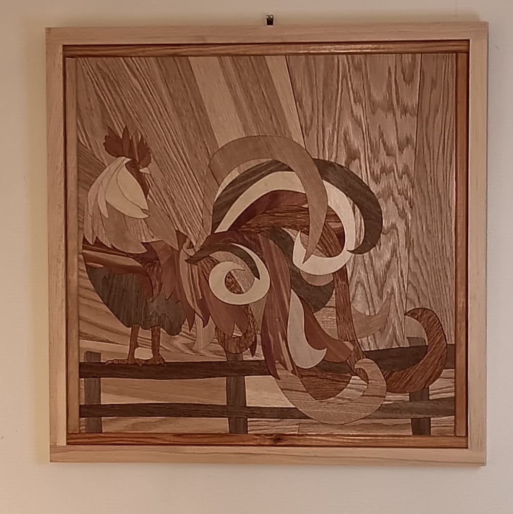 Elevate your decor with this stunning rooster artwork, measuring 24 x 24 inches (26 x 26 inches with frame). Crafted with a beautiful selection of cedar, mahogany, maple, walnut, and hickory woods, this piece showcases exquisite craftsmanship and natural beauty.