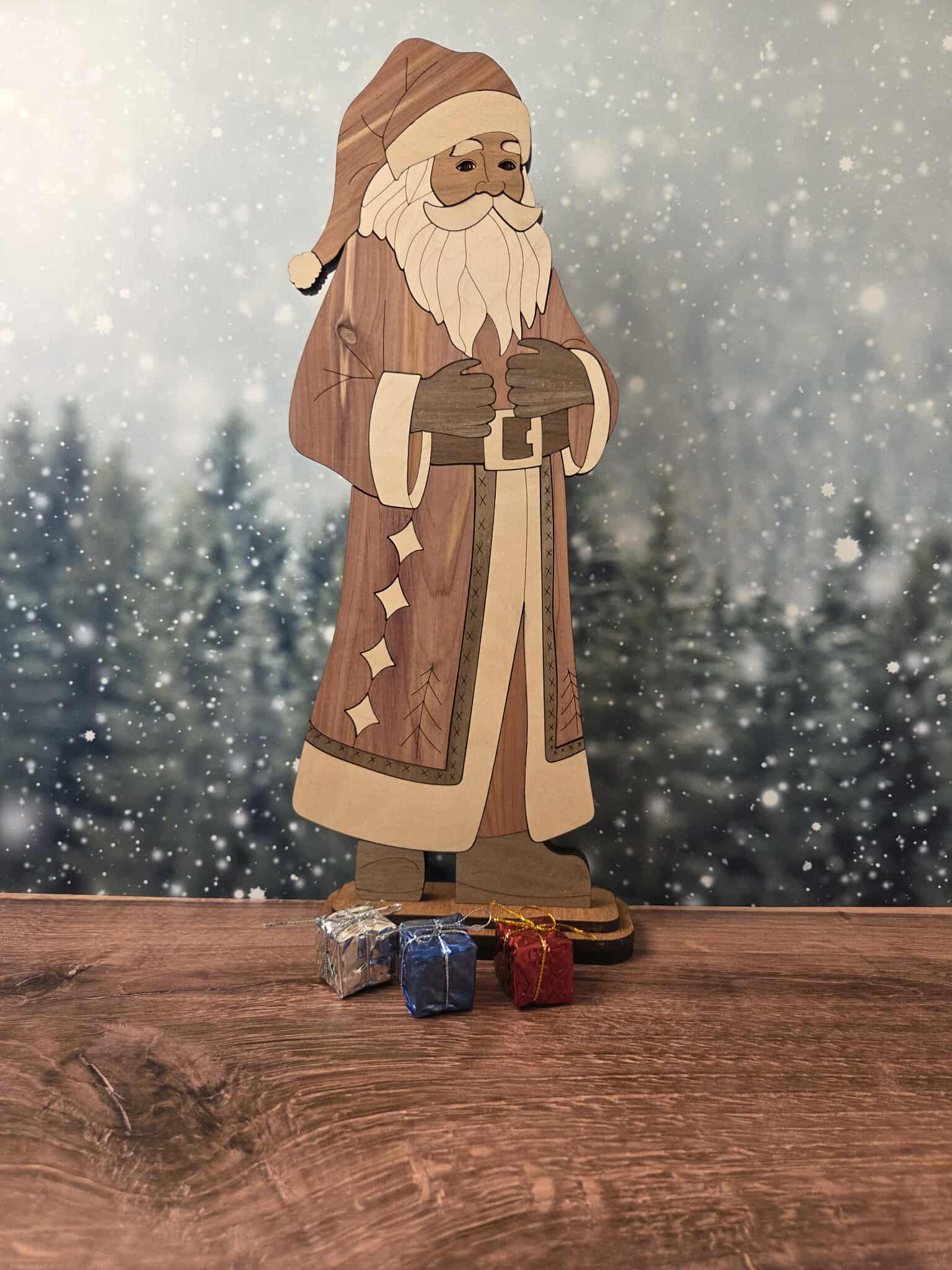 Design: Classic Santa Claus with intricate detailing and natural wood tones